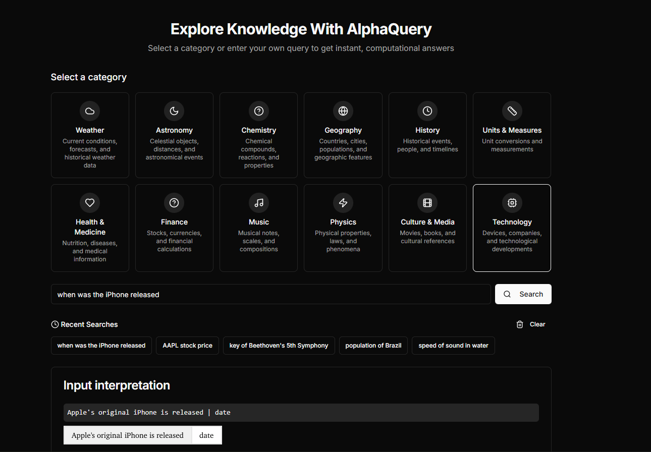 A query-based knowledge search platform that fetches structured answers using Wolfram APIs.